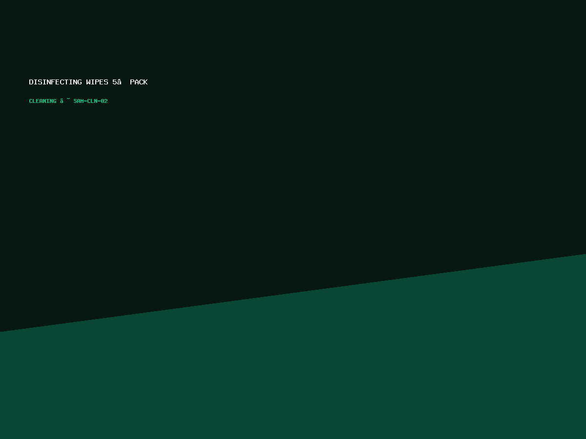 Home / Cleaning / Disinfecting Wipes 5‑pack Disinfecting Wipes 5‑pack$11.45 Lemon Disinfecting Wipes 5‑pack quantity Add to cart SKU: SAM-CLN-02 Category: Cleaning Tag: sams Description Reviews (0) Description Canister wipes Reviews There are no reviews yet. Be the first to review “Disinfecting Wipes 5‑pack” Cancel replyYour rating * Rate… Perfect Good Average Not that bad Very poor Your review *Name * Email * Save my name, email, and website in this browser for the next time I comment. Related products Variety Chips 24‑pack $14.70 Add to cart Tide HE Liquid 92oz $12.60 Add to cart Bounce Dryer Sheets 240ct $8.82 Add to cart Laundry Basket (Large) $10.40 Add to cart