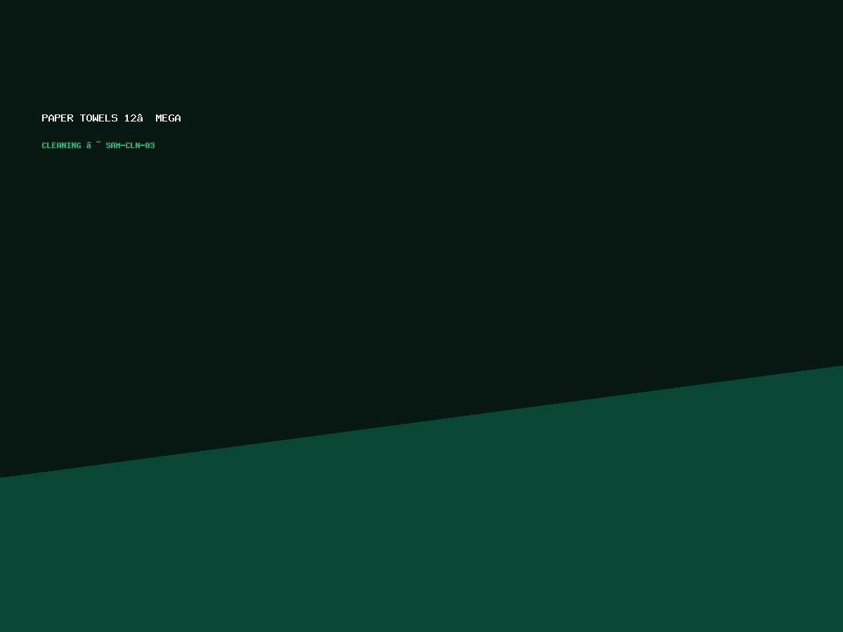 Home / Cleaning / Paper Towels 12‑mega Paper Towels 12‑mega$20.79 Extra absorbent Paper Towels 12‑mega quantity Add to cart SKU: SAM-CLN-03 Category: Cleaning Tag: sams Description Reviews (0) Description Select‑a‑size Reviews There are no reviews yet. Be the first to review “Paper Towels 12‑mega” Cancel replyYour rating * Rate… Perfect Good Average Not that bad Very poor Your review *Name * Email * Save my name, email, and website in this browser for the next time I comment. Related products Bleach 1gal $5.15 Add to cart Ground Beef 10 lb $33.60 Add to cart Granola Bars 48‑count $13.13 Add to cart Trail Mix 2.5lb $12.39 Add to cart