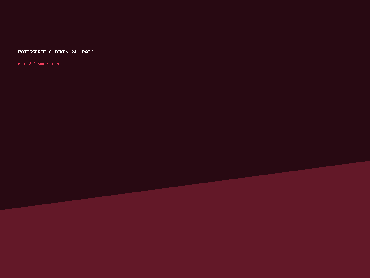Home / Meat / Rotisserie Chicken 2‑pack Rotisserie Chicken 2‑pack$13.44 Ready to eat Rotisserie Chicken 2‑pack quantity Add to cart SKU: SAM-MEAT-13 Category: Meat Tag: sams Description Reviews (0) Description Classic seasoning Reviews There are no reviews yet. Be the first to review “Rotisserie Chicken 2‑pack” Cancel replyYour rating * Rate… Perfect Good Average Not that bad Very poor Your review *Name * Email * Save my name, email, and website in this browser for the next time I comment. Related products Tilapia Fillets 10 lb $26.25 Add to cart Bacon 4 lb $17.33 Add to cart Chicken Breast 10 lb $29.40 Add to cart Jasmine Rice 25 lb $22.05 Add to cart