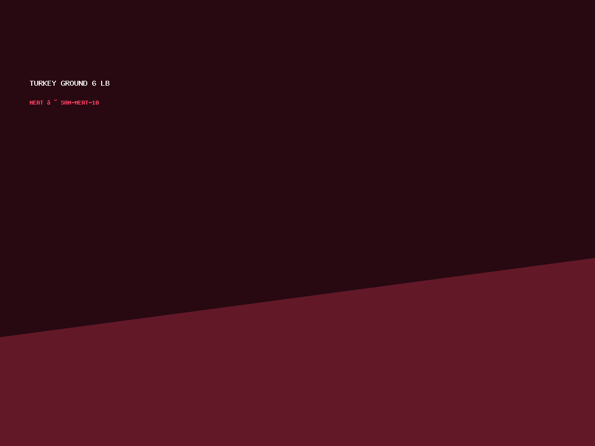 Home / Meat / Turkey Ground 6 lb Turkey Ground 6 lb$19.43 Lean Turkey Ground 6 lb quantity Add to cart SKU: SAM-MEAT-10 Category: Meat Tag: sams Description Reviews (0) Description 1.5lb packs Reviews There are no reviews yet. Be the first to review “Turkey Ground 6 lb” Cancel replyYour rating * Rate… Perfect Good Average Not that bad Very poor Your review *Name * Email * Save my name, email, and website in this browser for the next time I comment. Related products Salmon Portions 6 lb $40.95 Add to cart Variety Chips 24‑pack $14.70 Add to cart Chicken Breast 10 lb $29.40 Add to cart Tilapia Fillets 10 lb $26.25 Add to cart